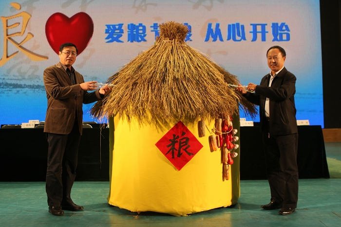 副校长夏敏和原省农委副主任钱程广向象征着丰收的粮仓内注入五谷杂粮,标志着爱粮节粮活动月正式启动