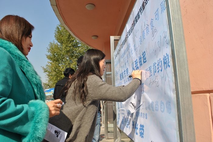 启动仪式后,“爱粮节粮”协会分别在红烛园和第四生活区食堂门口举行了“爱粮节粮从我做起”签字宣传活动,500余名师生依次在宣传展板上郑重签名。