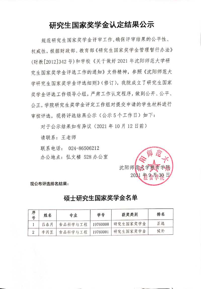2021年yl23411永利集团官网研究生国家奖学金认定结果公示