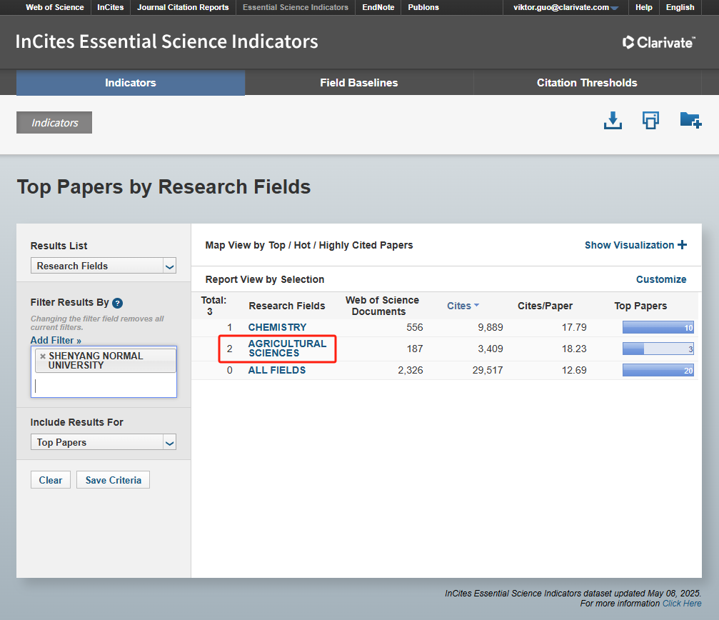 据科睿唯安2025年5月公布的最新基本科学指标数据库(Essential Science Indicators,简称ESI)统计数据,我校农业科学学科首次进入ESI全球排名前1%,这是继去年我校化学学科进入ESI全球排名前1%后,学科建设取得的又一新突破。